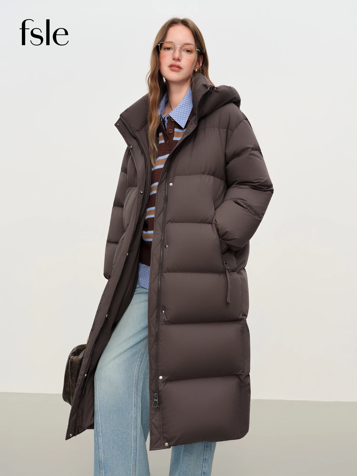 FSLE 2025 겨울 여성용 롱 다운 코트 스탠드 칼라 후드 스트레이트 컷 보온 패딩 방풍 아우터웨어 추운 날씨용