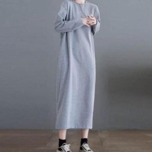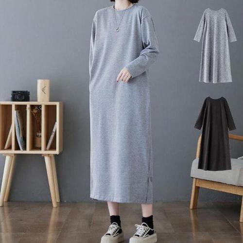 [옷자락]여성 캐주얼 무지 라운드넥 긴팔 롱 원피스