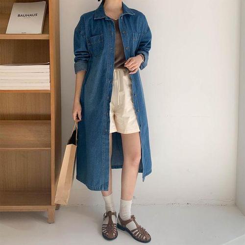 [옷자락] 여성 캐주얼 더블포켓 카라넥 데님 롱 원피스