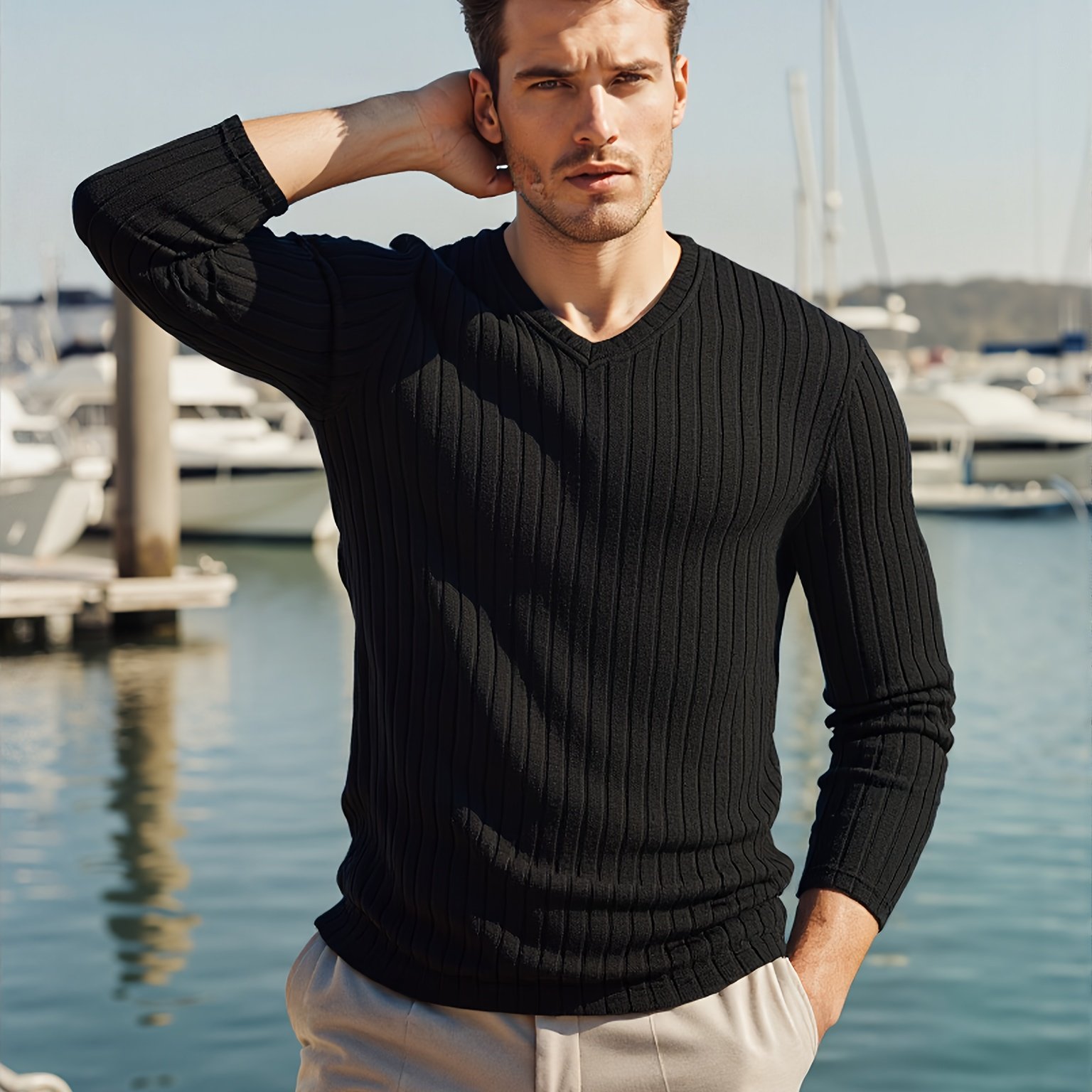 TEMU [Shule Water OBM] 남성용 트렌디 스포츠 V넥 스웨트셔츠는 편안하고 피부 친화적인 골지 텍스처 패턴을 특징으로 하며, 캐주얼한 외출 및 일상복에 적합합니다.