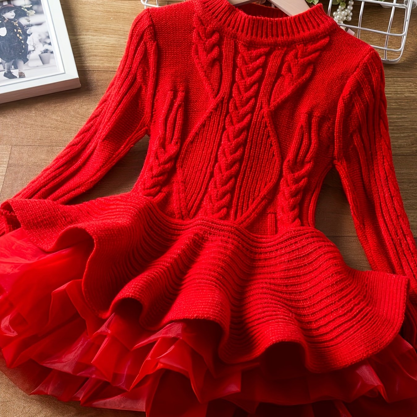 TEMU 2025 봄 신상 여아용 스웨터 니트 메쉬 패치워크 드레스 풀오버