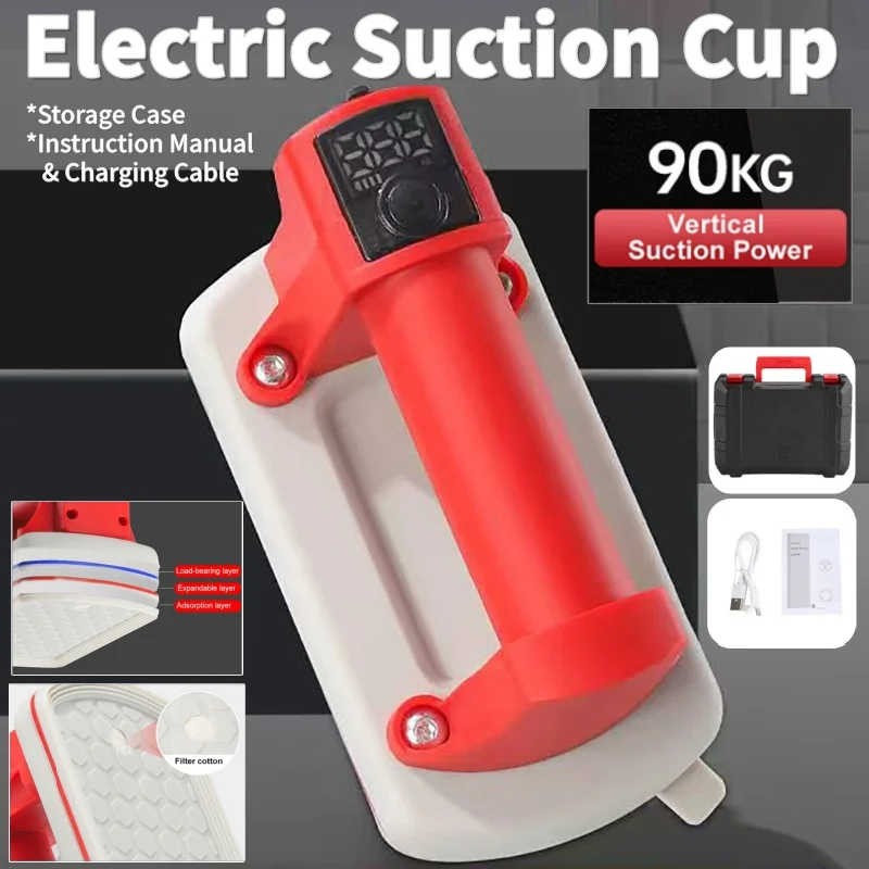 전기 진공 흡착컵 중량물 리프터 4000mAh 디지털 디스플레이 타일용 흡착컵 90KG 중량물 리프터 보관 케이스 포함
