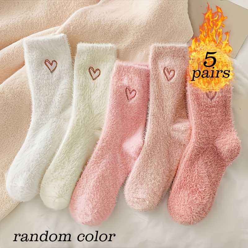 TEMU 하트 자수 양말 5켤레, 가을 겨울용 따뜻한 중목 홈 양말, 귀여운 보온 플러시 두꺼운 양말, 방한 바닥 양말, 청소년용, 추운 날씨 양말, 아늑한 홈웨어, 귀여운 양말, 스타일리시 양말, 플러시 텍스처, 부드러운 플러시 소재