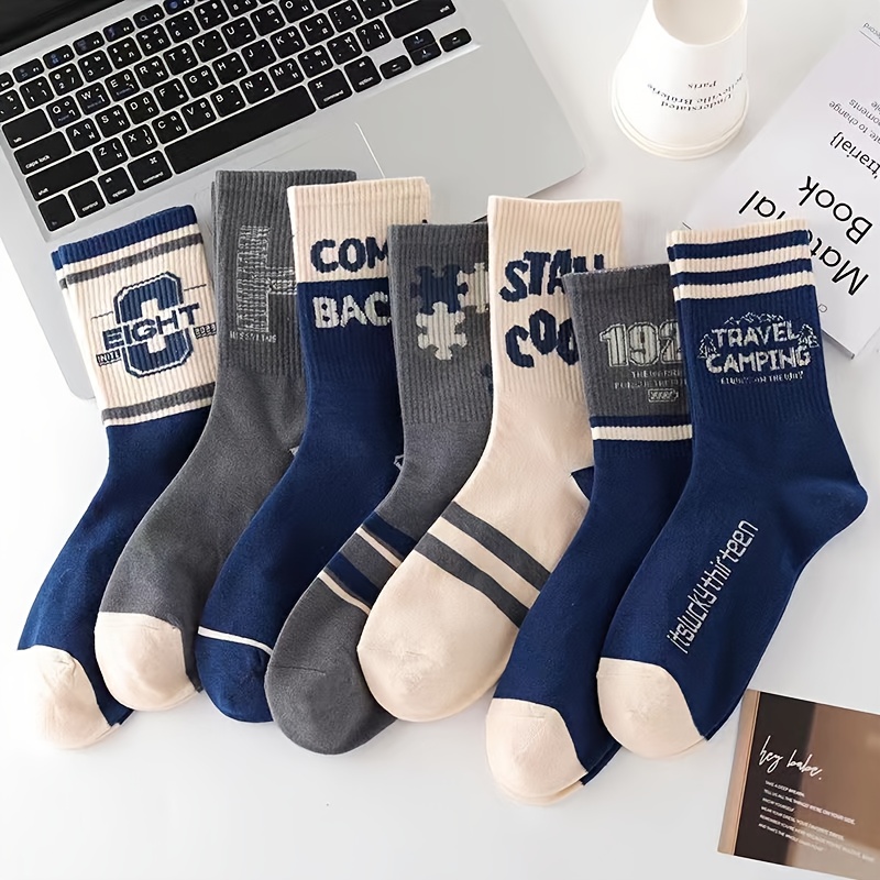 TEMU 7켤레 남성용 미드캘프 양말, 트렌디한 레터링 농구 스포츠 고가치 양말, 봄과 가을용 얇고 통기성 좋은 수분 흡수 양말, 캐주얼 스트리트 스타일 남성용 미드캘프 양말, 일상 사용에 적합