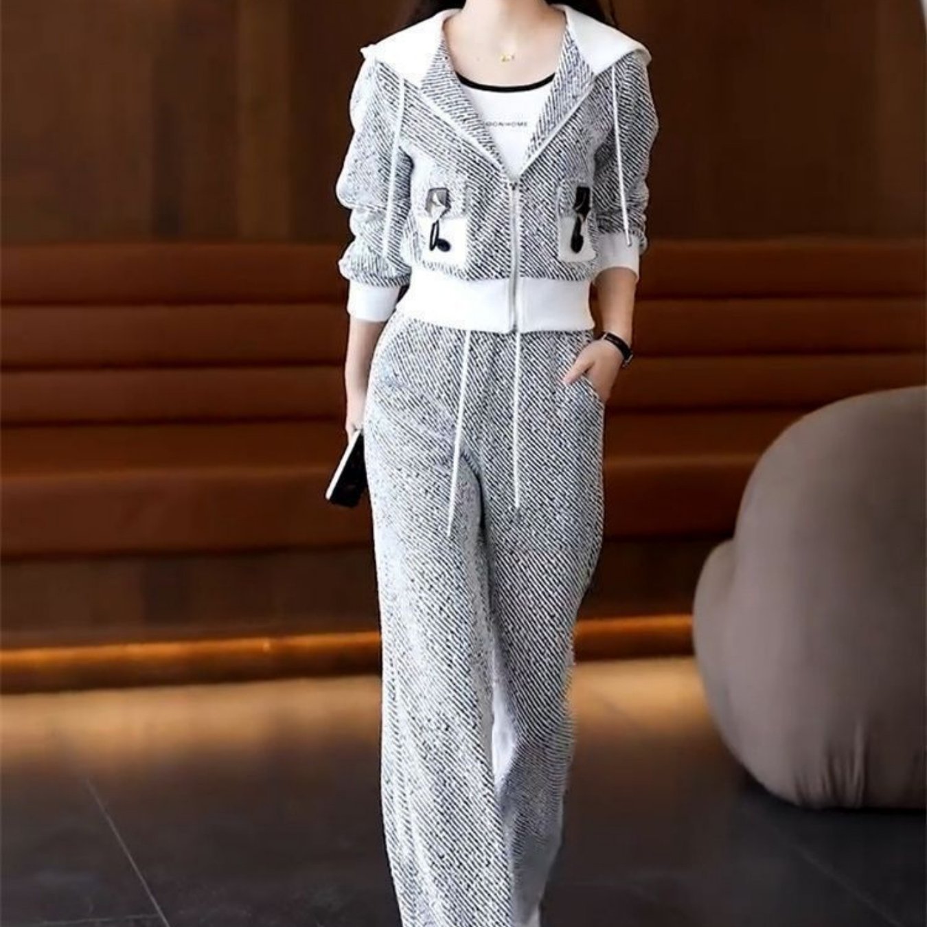 TEMU 캐주얼 스포츠 수트 여성용 2025 봄가을 신상 연령감소 후드 가디건 자켓 80년대 여성 투피스 세트