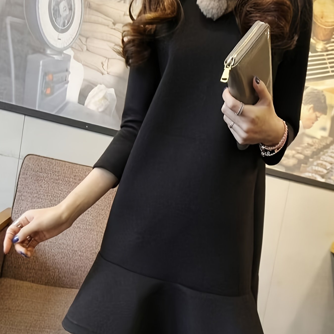 TEMU 여성용 블랙 A라인 드레스 - 롱 슬리브 오피스부터 파티까지, 핏감 좋은 기장, 가을/겨울/연중 착용 가능, 세탁기 사용 가능한 포멀 & 캐주얼 스타일, 매끈한 파티드레스, 비침 방지 원단