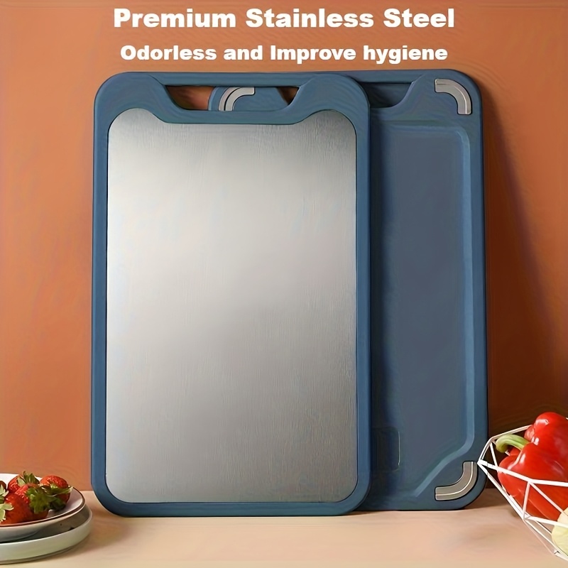 TEMU 스테인리스 스틸 양면 도마 - 미끄럼 방지 주방 도마, 걸이 구멍 포함, 세척 쉬움 & 내구성, 식품 등급 다기능 도마, 고기, 채소, 과일, 가정 요리용, 세련된 디자인, 고품질 소재, 미리 준비 요리용