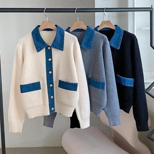 [다잇템][다잇템] 여자 콘트라스트 진 코디 스웨터 U넥 가디건_18897472_588872