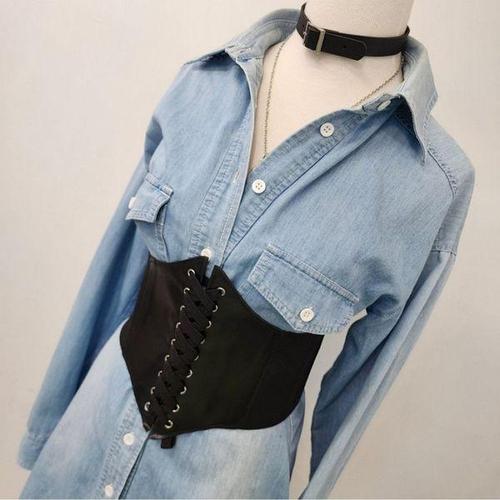 [다잇템]여성 티셔츠와 롱슬리브 코르셋 키치 가죽 세트