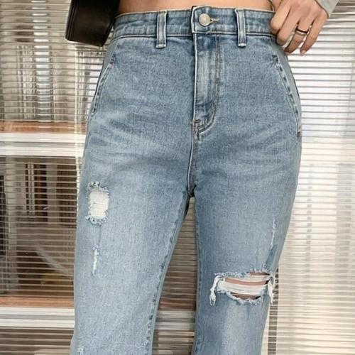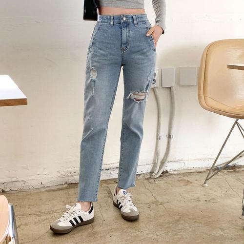 [옷자락]여성 봄철 데미지 신축성 스키니 바지