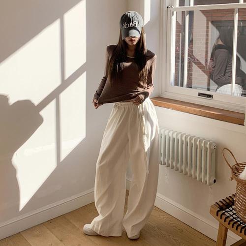[신상오픈런]여성용 면혼합 루즈핏 스트랩 절개 디자인 와이드 바지