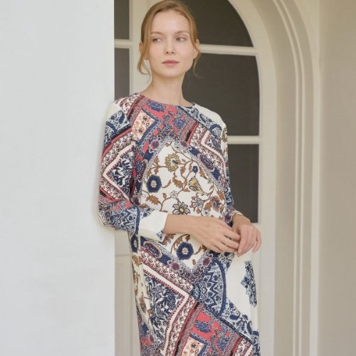 TEMU 여성용 만다린 칼라 긴팔 프린트 프렌치 바로크 패턴 바디콘 드레스 | 시크 스타일, 올 시즌, 성인 핏