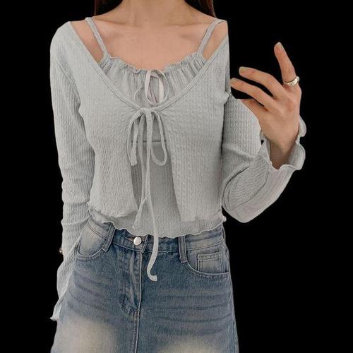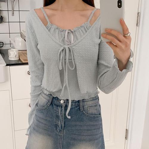 [옷자락]여자 봄맞이 날라리 리본 캡나시 크롭 가디건 세트
