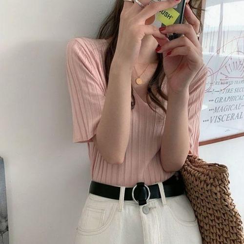 [에이치플러스몰]여름 인기 여성 브이넥 쿨 감성 반팔 니트 티 셔츠 크