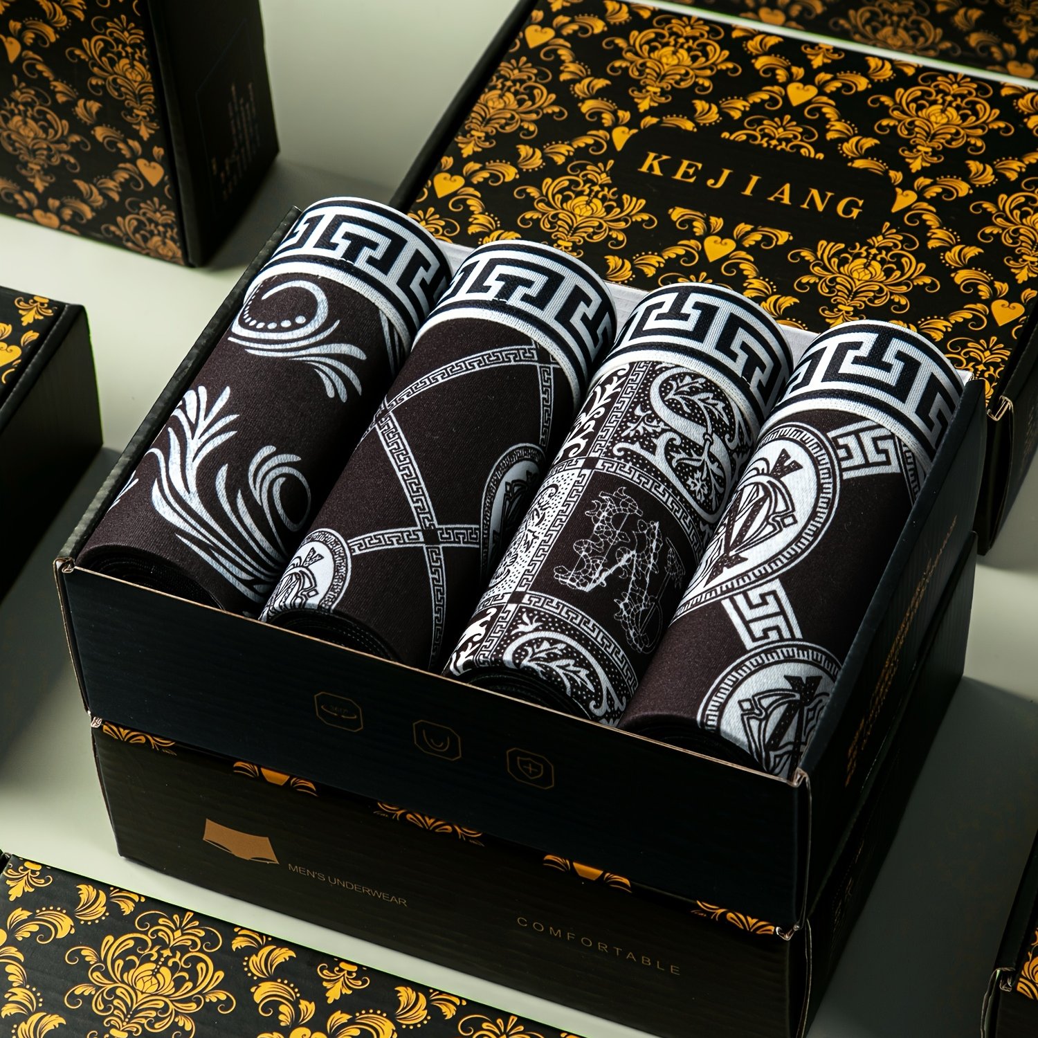TEMU 남성용 프린트 플랫 코너 속옷 4개 세트, 고급스러운 블랙 앤 화이트 럭셔리 남성용 신축성 플랫 코너 속옷, 남성용 통기성 빠른 건조 플랫 코너 쇼츠