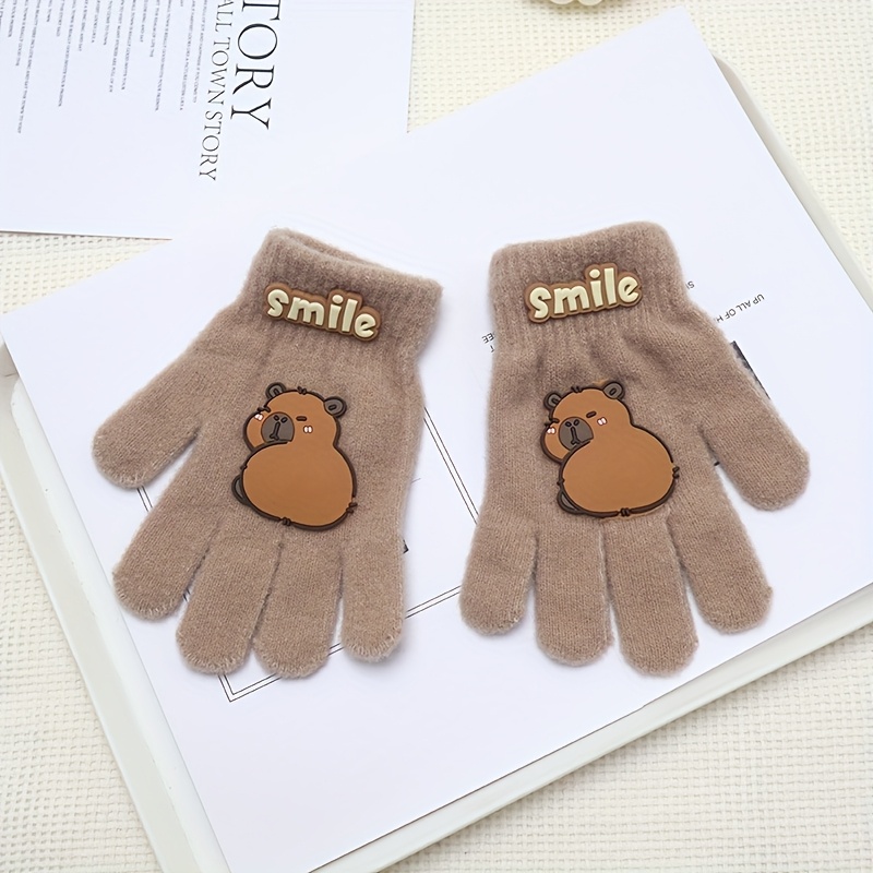 TEMU 1개 카피바라 겨울 따뜻한 풀핑거 만화 두꺼운 장갑, 웃는 얼굴 & 하트 컷아웃의 귀여운 곰 디자인, 추운 날씨를 위한 탄성 있는 핏, 귀여운 장갑, 재미있는 디자인, 튼튼한 장갑, 따뜻한 장갑, 추운 날씨 장갑, 쇼핑객