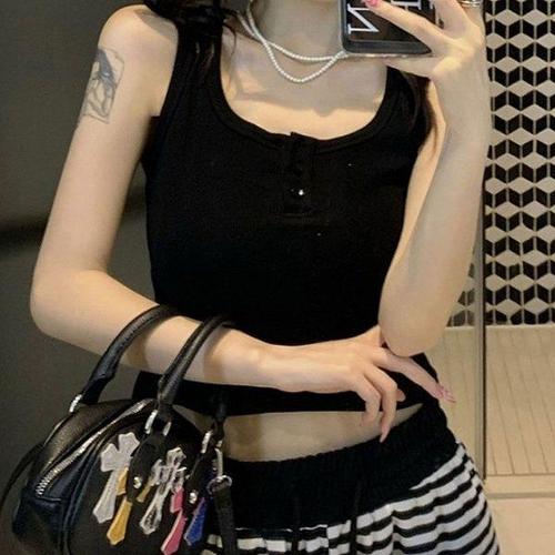 [에이치플러스몰]골지 버튼 나시 크롭 라운드 크롭탑 이너웨어