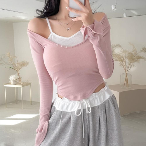 옷자락 / 여성 배색 민소매 레이어드 크롭 긴팔 티셔츠