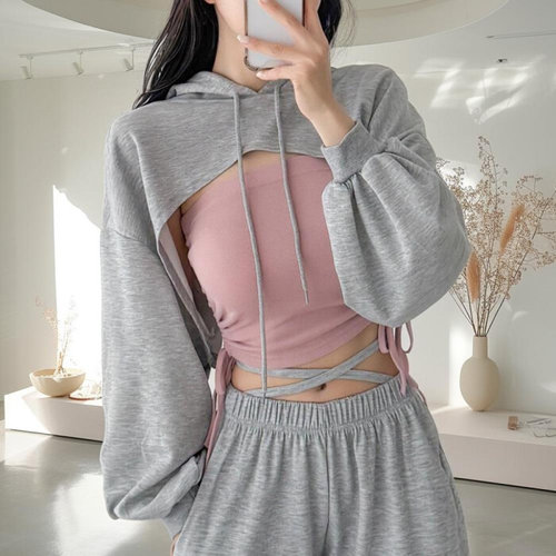 옷자락 / 여자 나시 레이어드 트임 크롭 후드 긴팔 티셔츠
