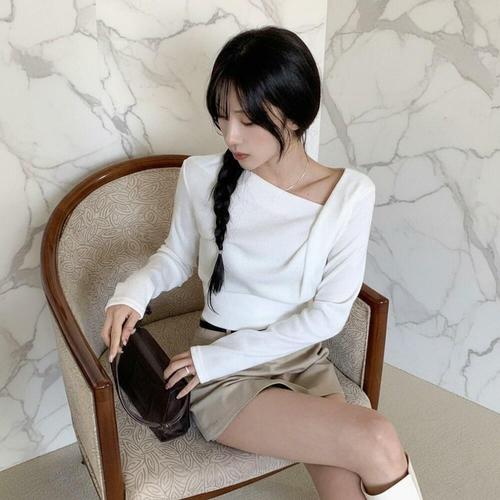 [미라클세븐]여성 슬림핏 언발란스 넥 크롭 스판 긴팔 니트 탑