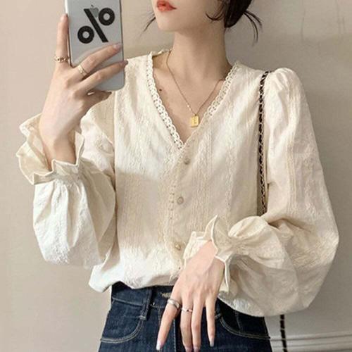 플랜앤유 여자 레이스 포인트 내추럴 루즈핏 셔츠 블라우스 긴팔 셔츠
