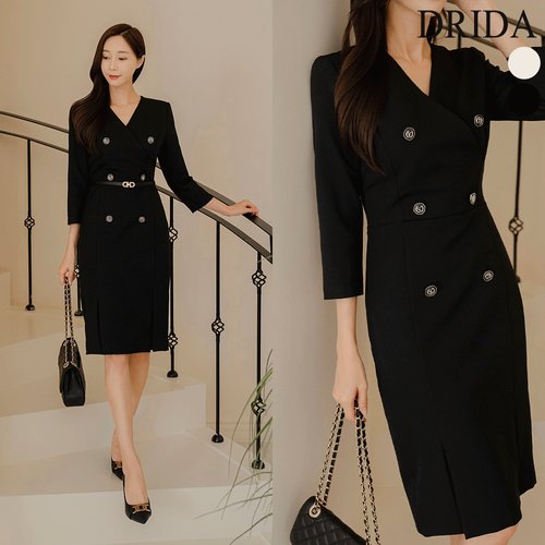 드리다 여성 봄 가을 브이넥 더블버튼 슬림핏 H라인 빅사이즈 정장 원피스 하객 미시 오피스룩 상견례