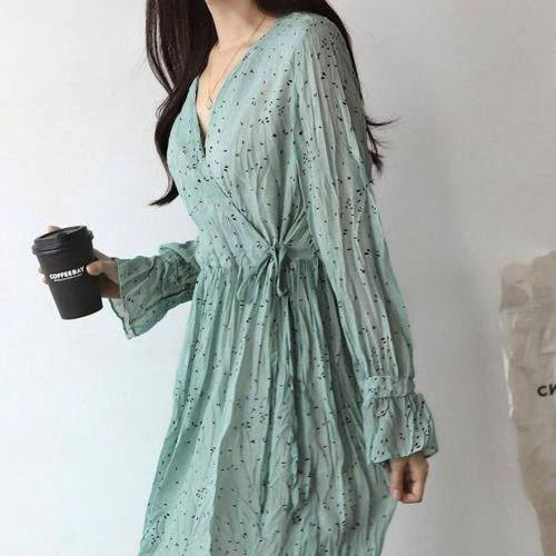 유아몽드 / 플레어라인 슬림핏 롱 원피스 브이넥 허리 밴딩 포인