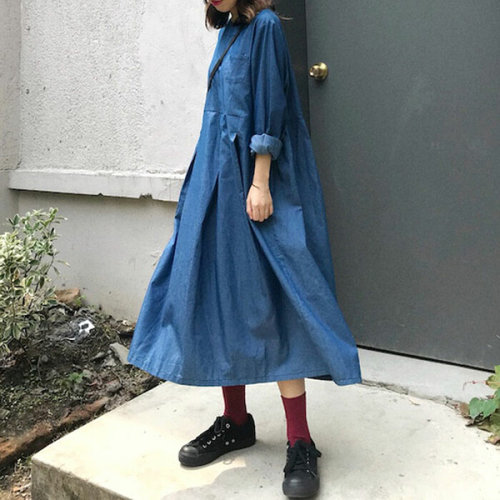 레이츄 / 무배 레이디 헨리넥 가을 데님 청 롱원피스