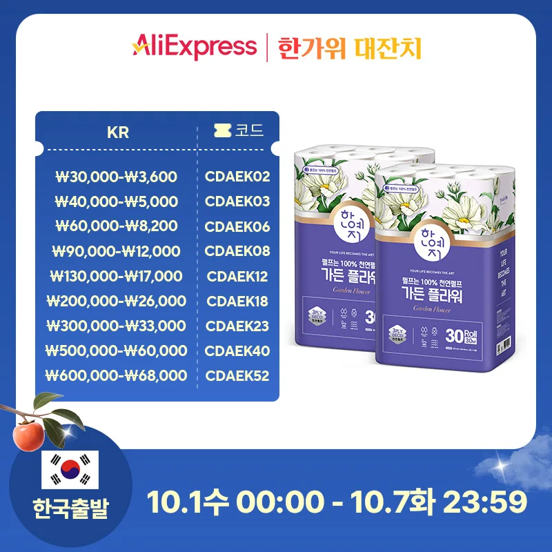 한예지 가든플라워 천연펄프 3겹 화장지 30m 30롤 2팩