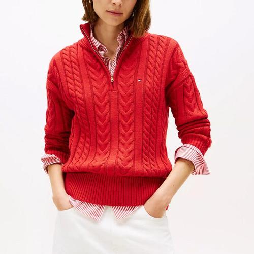 [해외배송] 타미 여성 꽈배기 니트 쿼터 집업 스웨터 Red