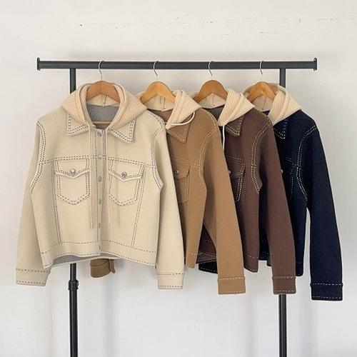 [신상오픈런]여자 스티치 니트 카라넥 탈부착후드 포켓 투웨이 자켓