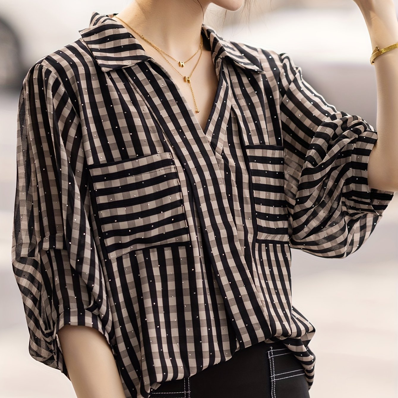 TEMU 여성용 우아한 루즈핏 V넥 블라우스 - 3/4 소매 셔츠, 비대칭 밑단, 봄 여름 가을용 통기성 검정 & 흰색 줄무늬, 캐주얼 및 정장용, 계절 패션 탑, 버튼업 프론트