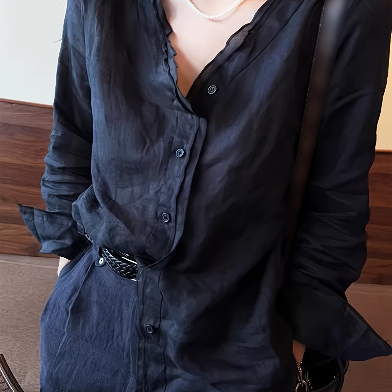 TEMU 여성 캐주얼 버튼업 셔츠 - 긴소매, V넥, 가볍고 통기성이 좋음, 봄/여름/가을에 적합, 캐주얼 복장에 완벽, 여성 블라우스