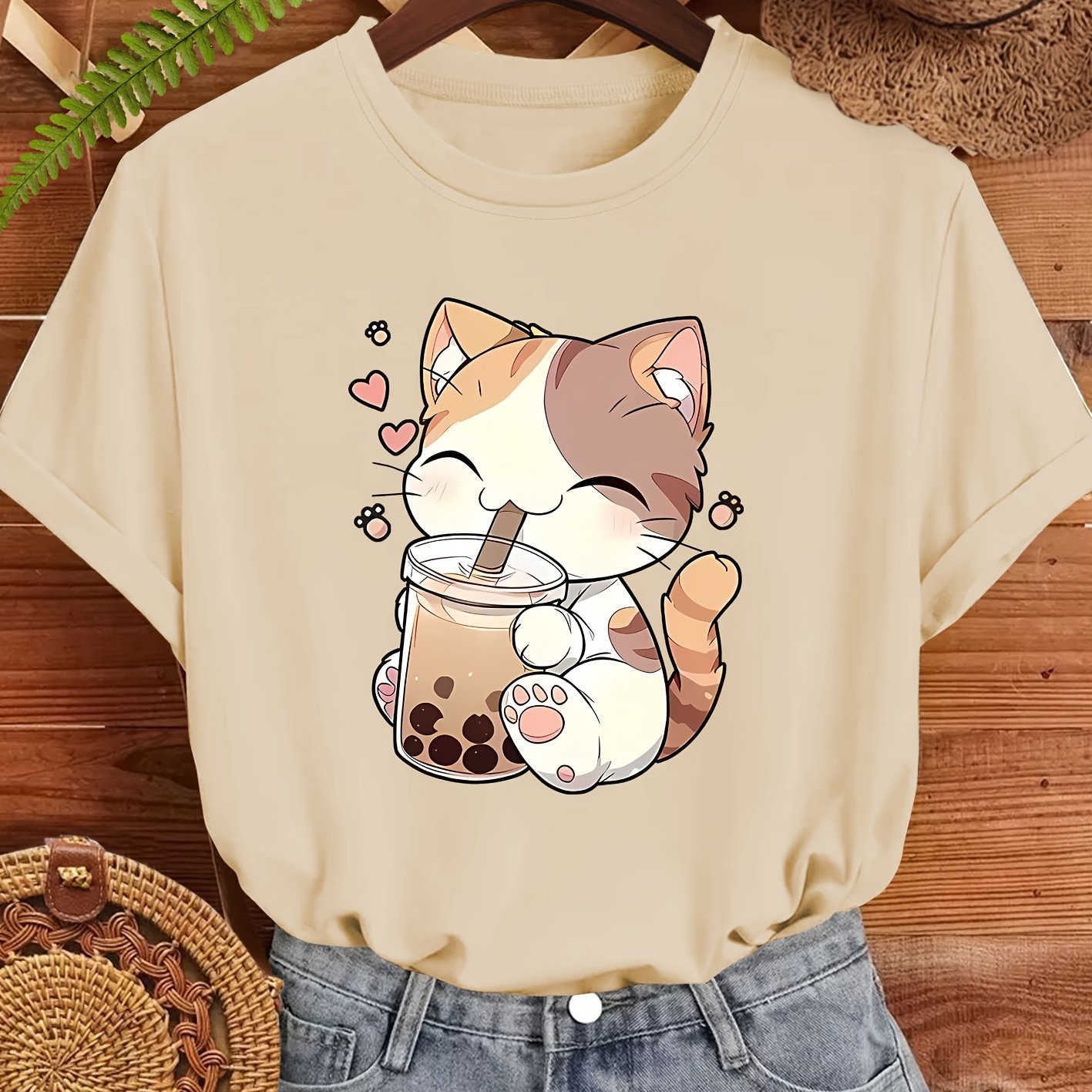 TEMU 웃는 귀여운 패턴 오렌지 탭이 고양이가 우유 차를 행복하게 들고 있으며, 작은 하트 프린트 디자인을 특징으로 합니다. 이 빈티지, , 신선하고 세련된 여성용 캐주얼 스포츠 티셔츠는 반원형 넥과 짧은 소매를 갖고 있으며, 봄과 여름에 완벽합니다.