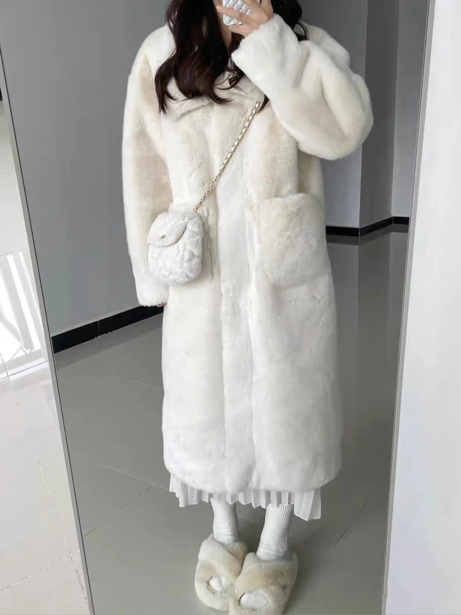 여성용 두꺼운 롱 코트 겨울 외투 인조 토끼털 루즈핏 따뜻한 중간 길이 재킷 출퇴근 스타일 폴리에스터 섬유