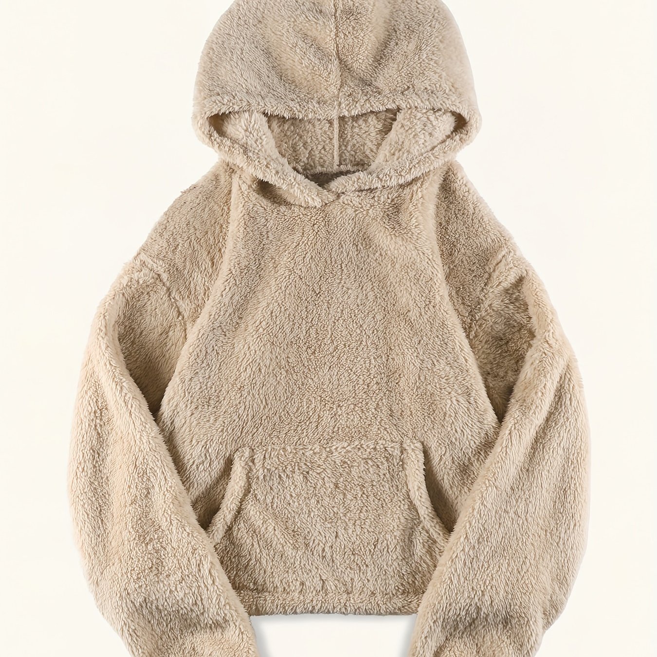 TEMU 여성용 겨울 후드티 - 베이지 오버사이즈 스웨트셔츠, 포켓 디자인, 따뜻한 후드 풀오버, 세탁기 사용 가능 캐주얼 아우터웨어, 스트릿웨어, 루즈핏, 야외 활동용, 보온 소재