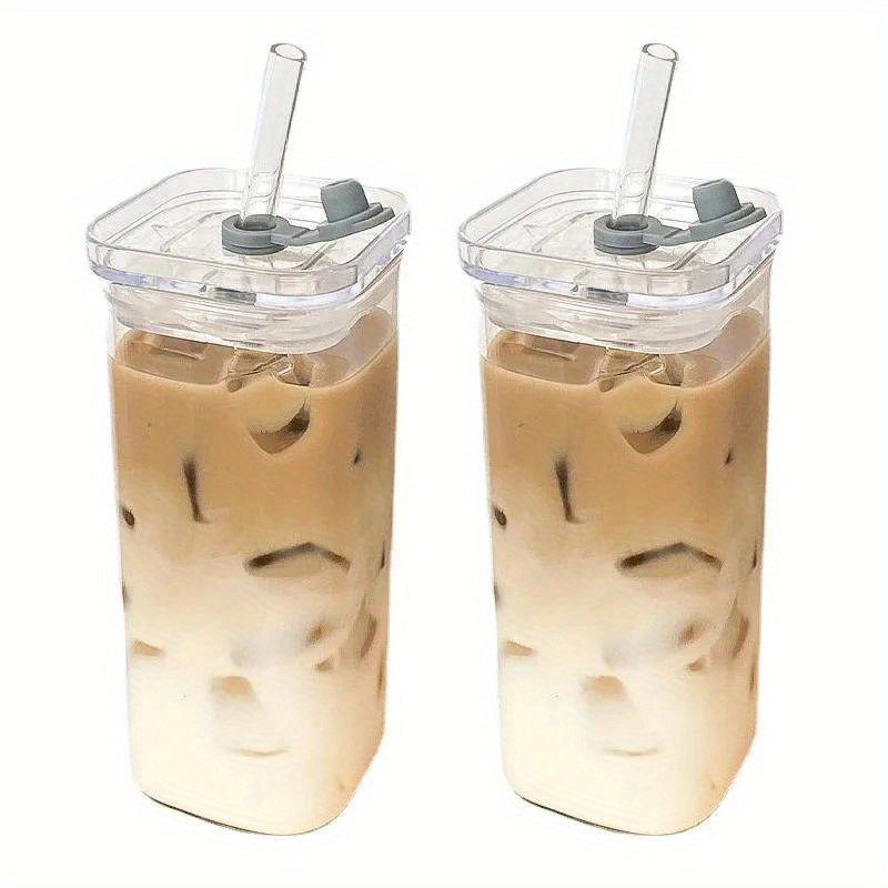 TEMU 1개 튼튼한 사각 유리컵, 내열성, 뚜껑 및 빨대 포함, 밀크티, 커피, 주스에 적합