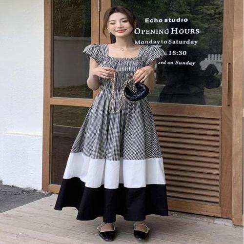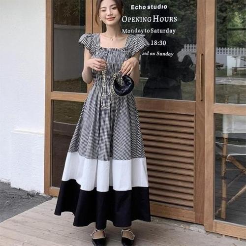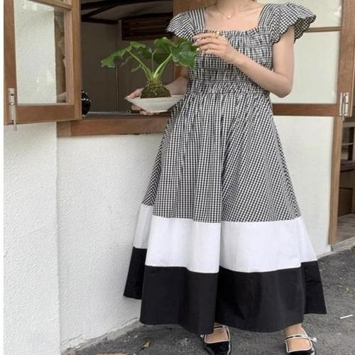 [엄지척]여성 체크패턴 배색 투톤 포인트 스모크밴딩 롱원피스_19910772_667501