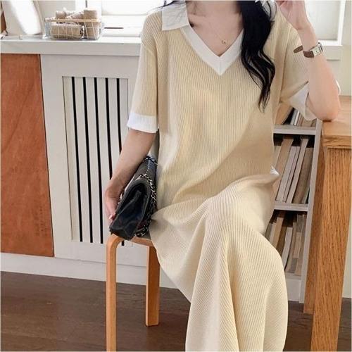 [엄지척]골지 원단 카라 브이넥 투톤배색 디테일 원피스_19914738_667501