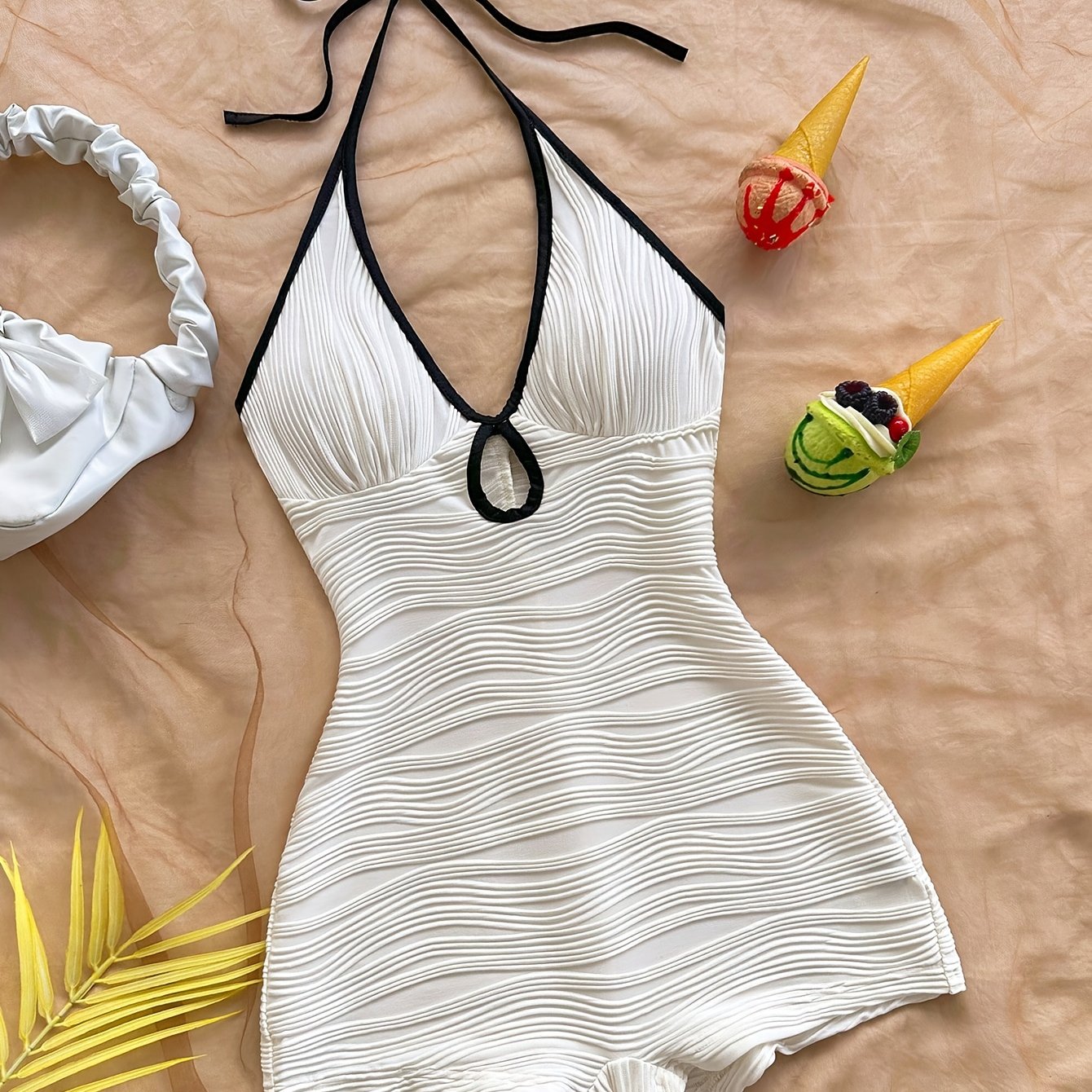 TEMU 여성용 고급스러운 텍스처 섹시 홀터넥 점프수트, 대비되는 트림, 스파 휴가 및 수영복에 적합, 바캉스 의상, 섹시 점프수트|임산부수영복