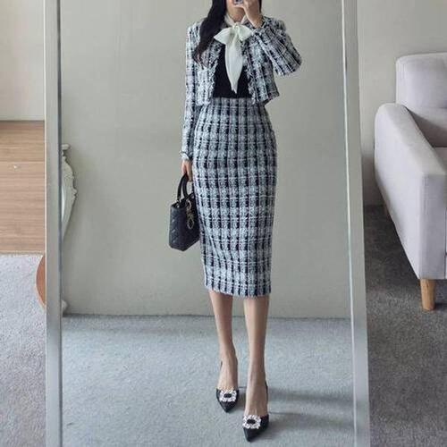 [엘린무드](세트) 프라이빗 체크 트위드 고퀄 숏 긴팔 어깨패드 자켓 H라인 미디 롱 스커트 세트 가을 투..