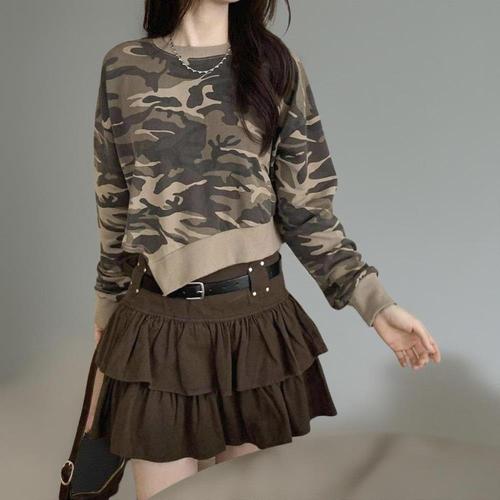 |KMT99E8|여성 카모플라주 언발란스 트임 크롭 맨투맨