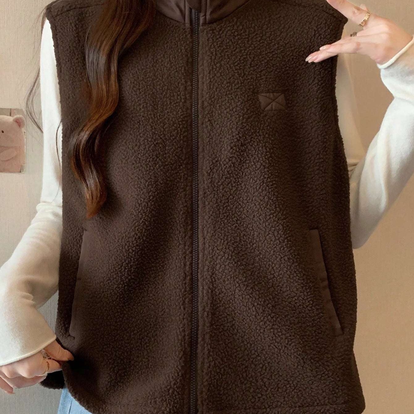 TEMU 여성용 캐주얼 겨울 자켓 - 브라운 스탠드 칼라 베스트형 코트, 지퍼 클로저, 루즈핏 아우터웨어, 레이어링용, 세탁기 사용 가능, 논스트레치 (없음) - 가을용 드레스/스커트 아우터