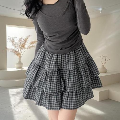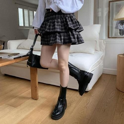 [다잇템]여성 고무줄 걸리쉬 격자 티어드 쁘띠 스커트