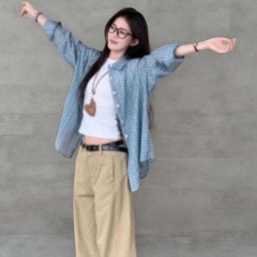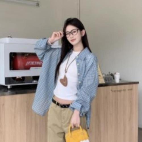 여자 세츠 파란색 격자 셔츠 박시핏 셔츠