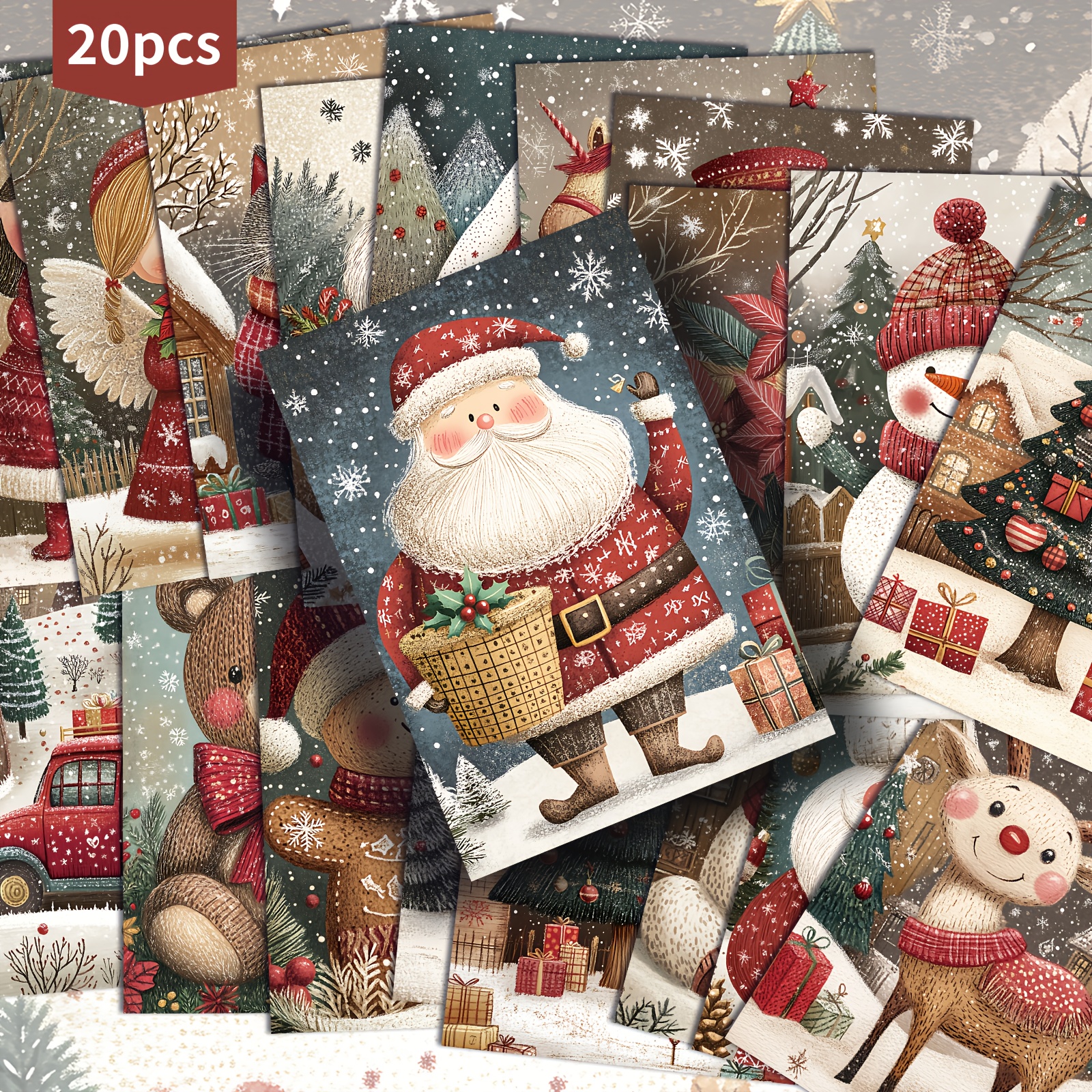 TEMU 20팩 ASSTSS 빈티지 크리스마스 엽서 - 4x6 인치 레트로 산타, 눈사람, 순록 & 겨울풍경과 빨간색 & 금빛 눈송이 패턴, Junk Journal용지 Scrapbooking, 선물태그, 파티초대장에 적합한 수집가성 있는 빈티지 데코러션카드 (미리 프린팅된 문구와 튼튼한 봉투) - 크리스마스, 새해, 생일, 기념일에 이상적