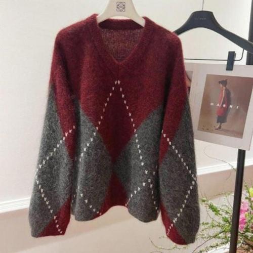 겨울 니트 여성 스웨터 루즈핏 도톰 아가일 브이 티 WFKZLT6