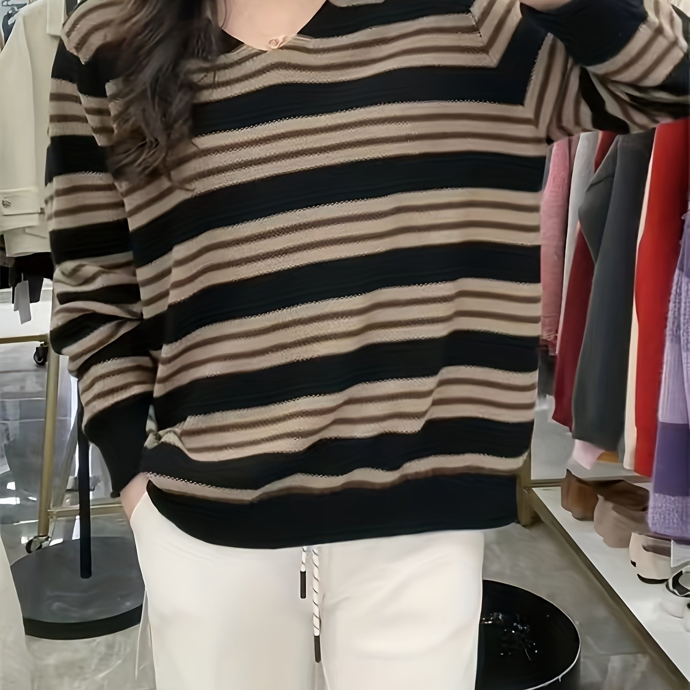 TEMU 여성용 시크 V넥 스웨터 - 긴소매, 컬러 블록 디자인, 브라운 & 세로 , 봄/가을 캐주얼 스타일, 캐주얼 웨어| 패턴|구성, 스웨터 드레스
