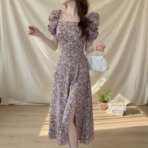 [신상오픈런]여성 퍼프 소매 스퀘어넥 롱 원피스 앞트임 플레어 드레스 (46200140)