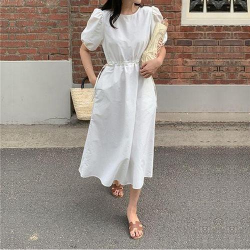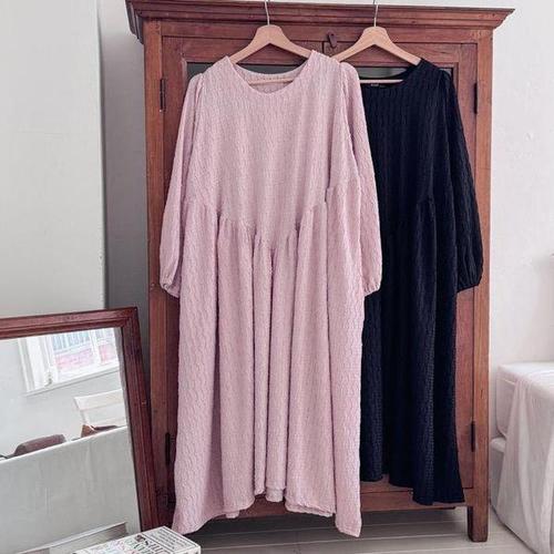 여성 루즈핏 스판 아이스 퍼프 라운드 롱 원피스